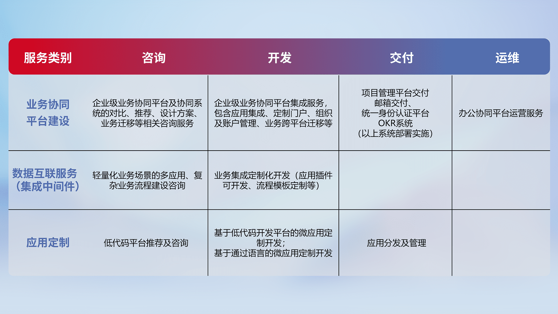针对钉钉、、、企微、、IDaas等平台级产品提供产品的规划、、、、方案、、交付、、、定制化开发等服务,,,实现如统一协同办公、、、、智能客户服务、、混合会议管理、、智能数据查询、、、等业务场景,,,,实现数字化转型。。。